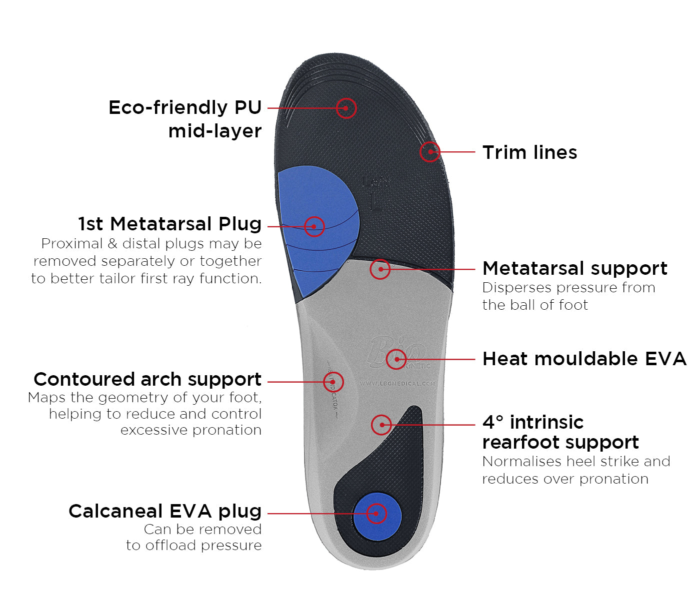 Bio Kinetic is designed to restore natural movement by improving forefoot mobility and promoting smoother toe-off, combining hybrid EVA and eco-friendly PU materials for controlled support, lasting cushioning, and optimised 1st MTP joint function due to an Integrated 1st Met Removable multi-adjustable PU plug.